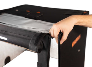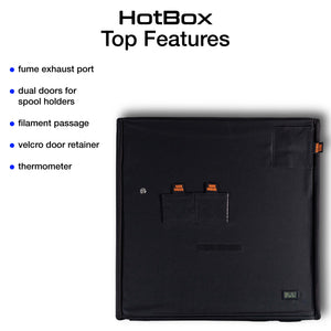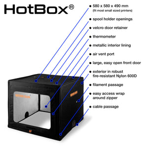 The HotBox® is made of high-grade Nylon 600D fabric with fire-resistant coating and lined with a metallic heat-deflecting internal liner that sandwiches around a strong, lightweight honeycomb insulating structure. The front panel has a large clear window for maximum visibility that easily lifts up and is secured by velcro for full access to your printer.